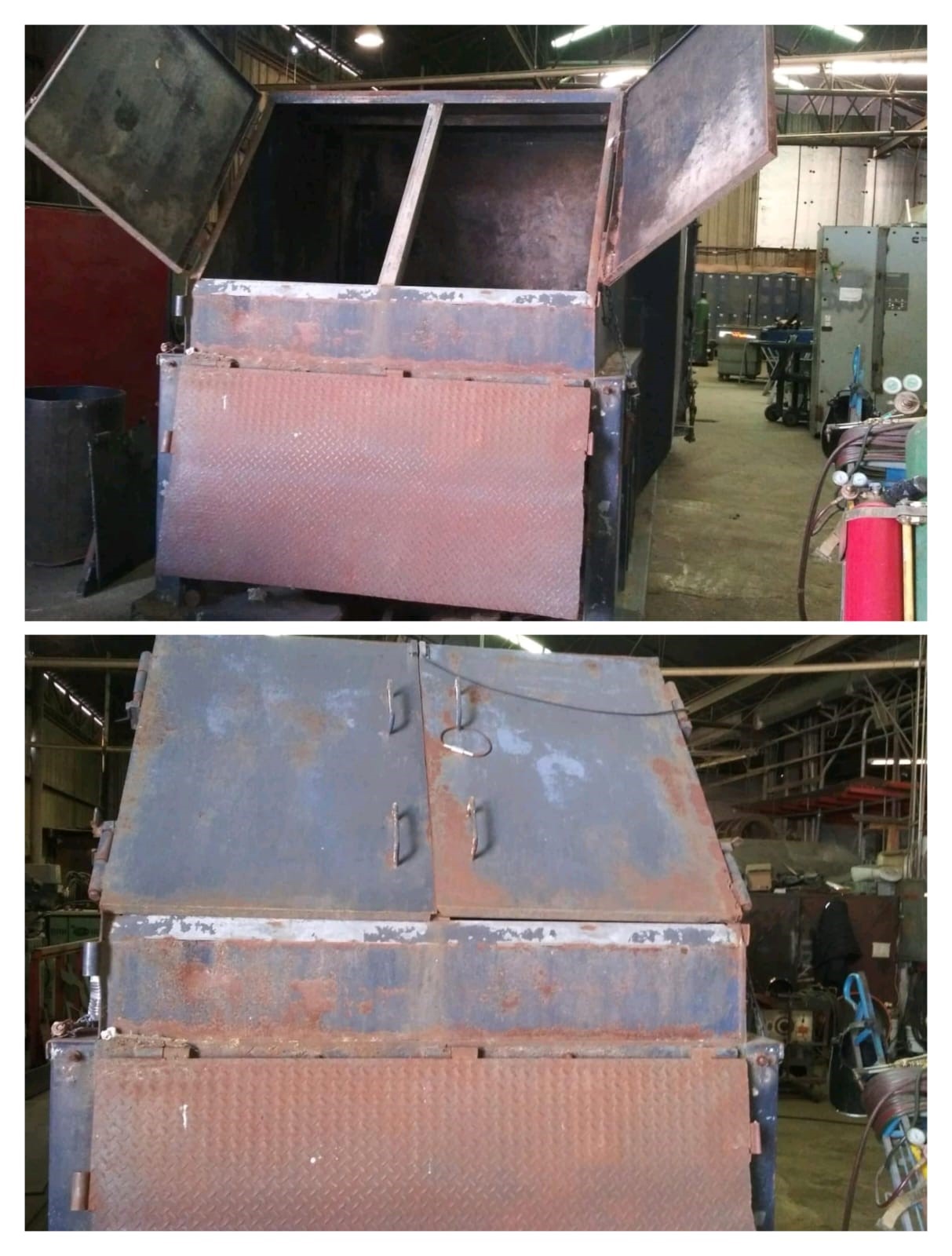 Se reemplazaron láminas desgastadas, se reconstruyeron compuertas y se reforzaron con bisagras soldadas, dejando la estructura lista para ser pintada o recubierta contra la corrosión.